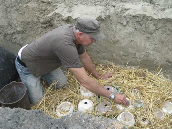 Our annual pit firing took place Saturday evening, July 5th at Dan Ferguson’s farm. Dan had the pit prepared and we all had fun helping setting our pots on their bed of sawdust and straw and watching Dan make the final tweaks before we covered them with another layer of straw and dried cow manure and wood.