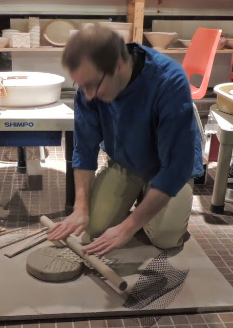 We normally know and love Thomas’s work for the flawlessness of it. His functional pieces are a delight and envy for fellow potters. His demonstration was a revelation though, as he was loosening things up and using found objects to create texture and with a throwing technique on a board, stretches and makes the textured piece thin enough to be a base of a bowl or platter. The photos below show the technique that he employs. No wonder potters like to collect all sorts of junk!