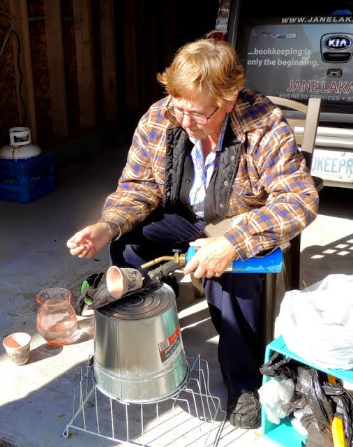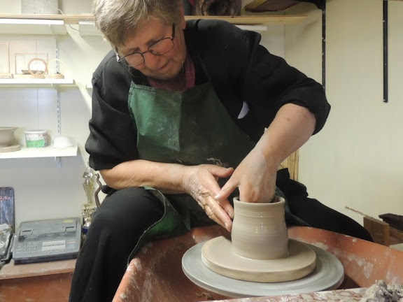 Fran is a new member of the guild and this year is her first in the Christmas Sale. Here is Fran on her wheel and burning a feather to a pot.