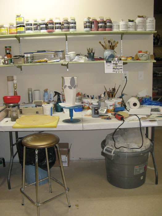 Last year when the doors first open for our sale, the woman that had been waiting for ten minutes outside (we let her and others into the vestibule to keep warm) was desperate to be the first to find the table of the person that “did this piece” and was it in the show. The piece that she was referring to was a platter with fish on it. And it was done by our talented Margrit Beesley. Here are some photos of work in progress in Margrit’s studio. See, she has made another of her popular platters, so no fighting!