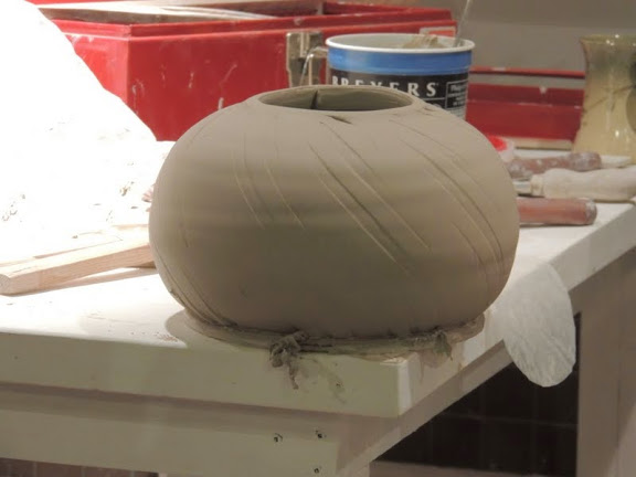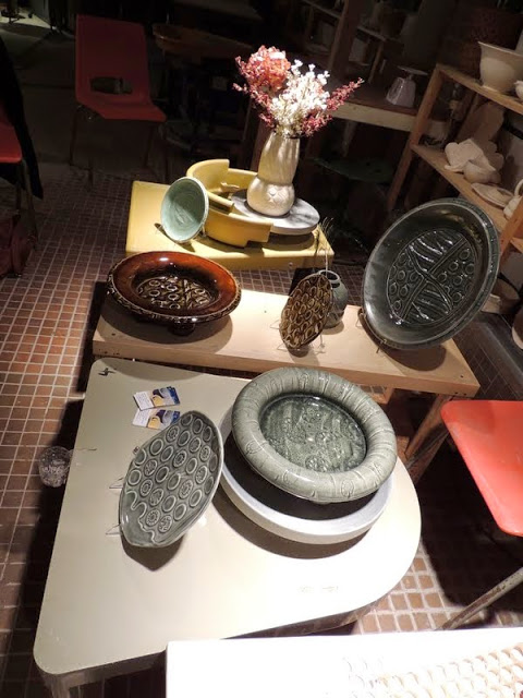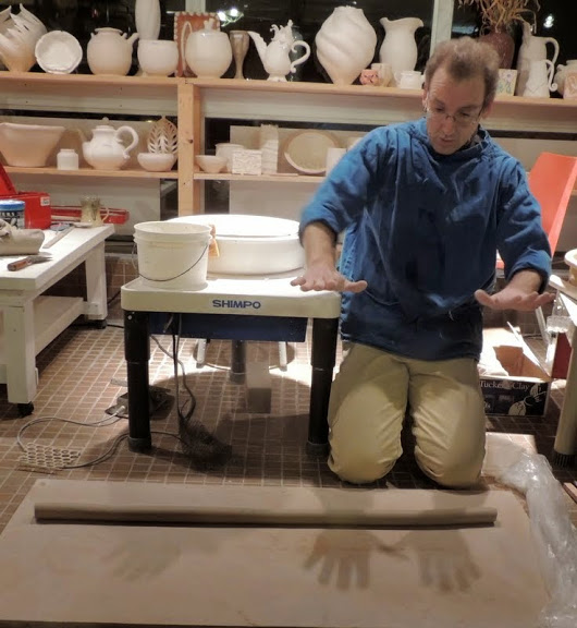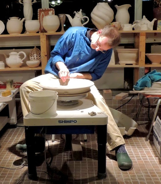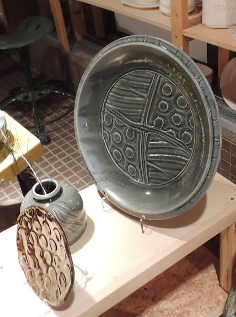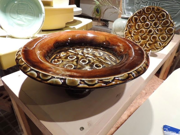 We normally know and love Thomas’s work for the flawlessness of it. His functional pieces are a delight and envy for fellow potters. His demonstration was a revelation though, as he was loosening things up and using found objects to create texture and with a throwing technique on a board, stretches and makes the textured piece thin enough to be a base of a bowl or platter. The photos below show the technique that he employs. No wonder potters like to collect all sorts of junk!