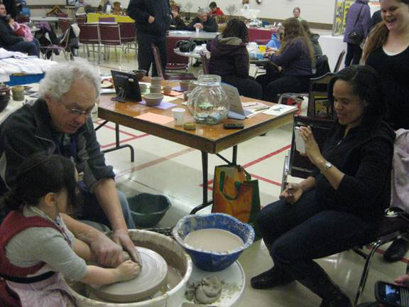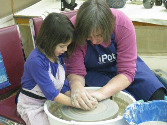 June Goodwin did her usual magic with the children, creating lots of small bowls. George Stewart finished the day with the kids (and one adult) making bowls and a flower pot. Vicky Kilner and Lillian Forester had the opportunity of talking with the parents and grandparents about the guild and the gallery, as well as promoting the kids camp this summer. A very successful day with plenty of happy faces on the children.