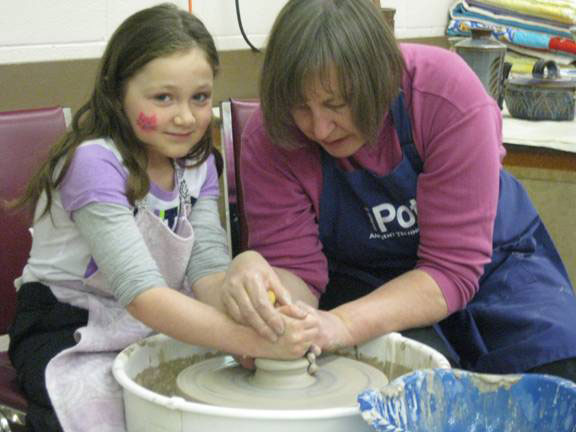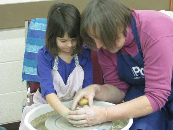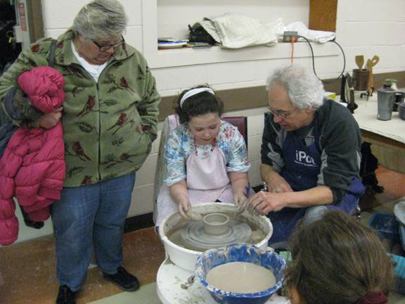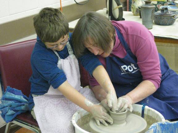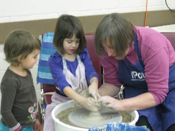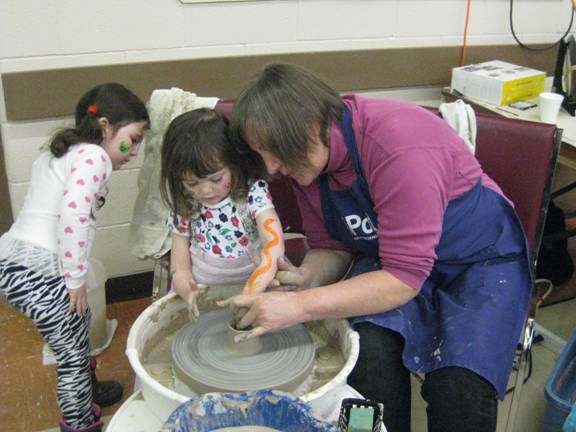 June Goodwin did her usual magic with the children, creating lots of small bowls. George Stewart finished the day with the kids (and one adult) making bowls and a flower pot. Vicky Kilner and Lillian Forester had the opportunity of talking with the parents and grandparents about the guild and the gallery, as well as promoting the kids camp this summer. A very successful day with plenty of happy faces on the children.