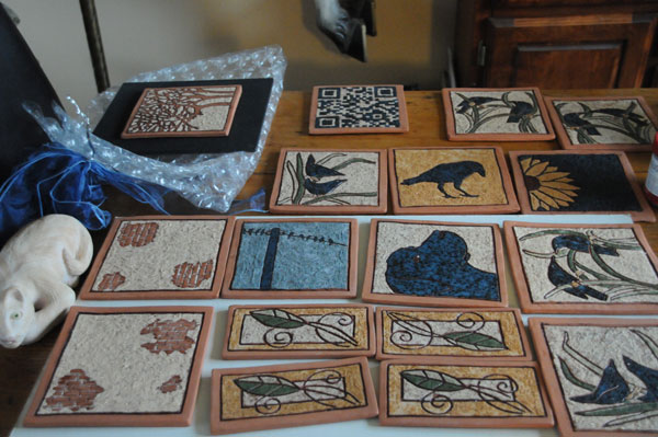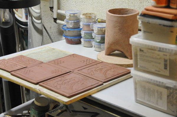 This summer I discussed an idea with my husband as it meant taking up a bit more room. I decided to make a quarter of the basement my pottery studio. The guild renovated our glaze area and there was an extra table that they were going to return and I promptly bought it. A friend and I set up the new space and I have to say it is so much easier to be productive now! I have my dry ingredients for glazes still outside, as it is safer for me to mix them there (you shouldn’t breathe that stuff in!) and the kiln is in the garage too, but everything else is in my space in the basement. I have one table to work on, right beside my pugmill, so if I need to soften up some clay from the many bags I have (see picture) it is easy to just move over and then start sculpting. I have a number of drywall boards cut into a manageable size and I place my work to dry (tiles especially, as they will warp if you let them dry without a bit of weight on top) and then they double as trays to take upstairs to load into the kiln! I have boards with cloth on them, one for white clay and another for brown, and I work on those and can easily swap them around. I’m close to the sink (it is my laundry room too) and I can rinse down anything to avoid dust.
