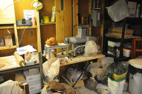 It’s likely not a very healthy idea to work with clay in a bedroom that is across from the room that you sleep in. Yet I have been doing that for over 8 years now. (oh well, we’ll all die of something) But the room was getting more and more cramped and I was not able to move or find a place to put down anything. Plus, I have my kiln out in the garage, my pugmill and extruder in the basement and I found that when I was in my art room I needed something from the garage, or if I wanted to pug some clay for a piece, I had to lug the clay down two flights of stairs, pug it and then lug it back up again. And clay ain’t light!